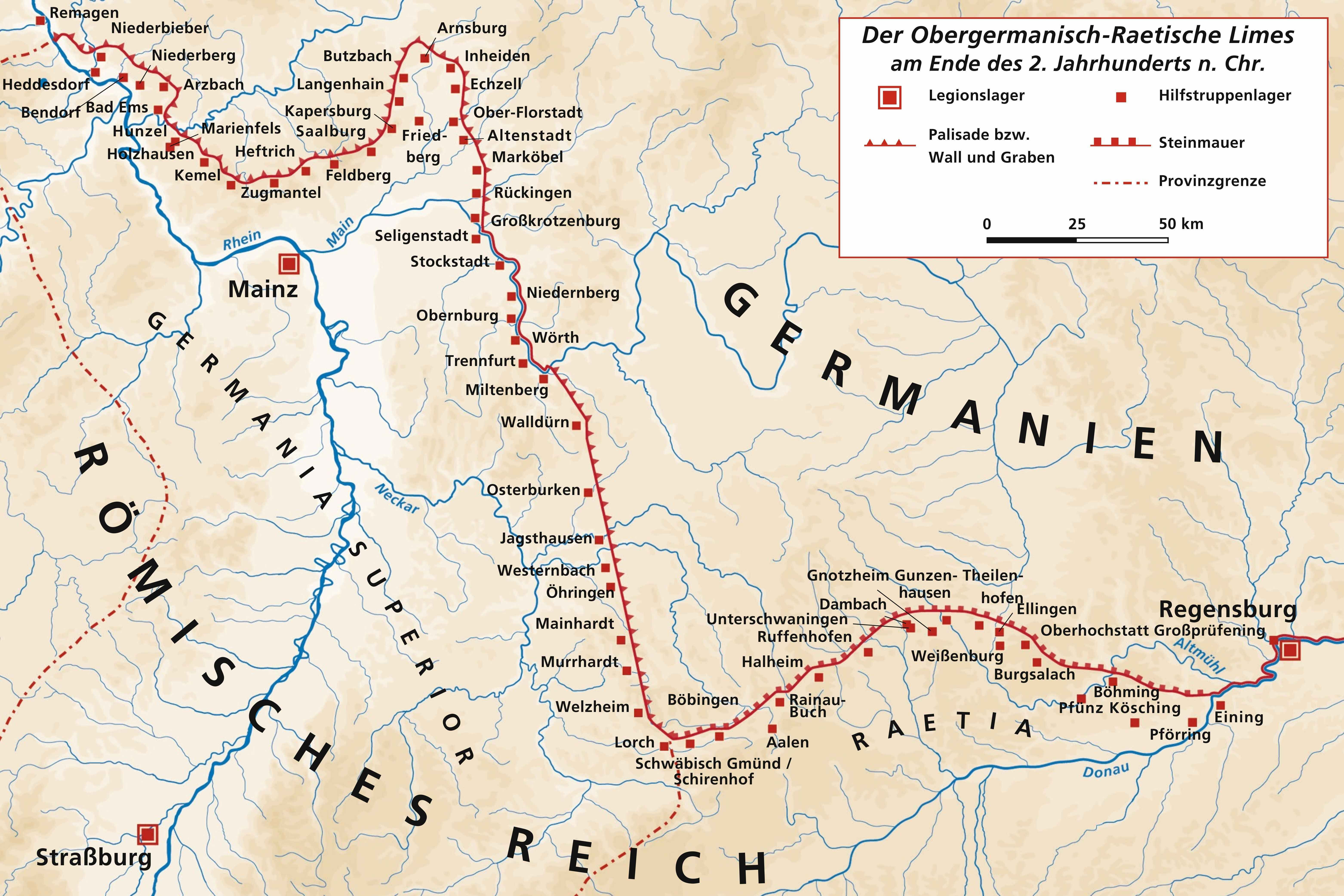 Der Obergermanisch-Raetische Limes beginnt am Rhein bei Rheinbrohl, verläuft auf einer Länge von 550 km durch die heutigen Bundesländer Rheinland-Pfalz, Hessen, Baden-Württemberg und Bayern und endet an der Donau bei Hienheim. Entlang dieser Strecke wurden ca. 120 Kastelle unterschiedlicher Größe sowie etwa 900 Wachttürme zur Kontrolle des Umlandes im bis dato weitgehend unbesiedeltes Grenzgebiet errichtet.