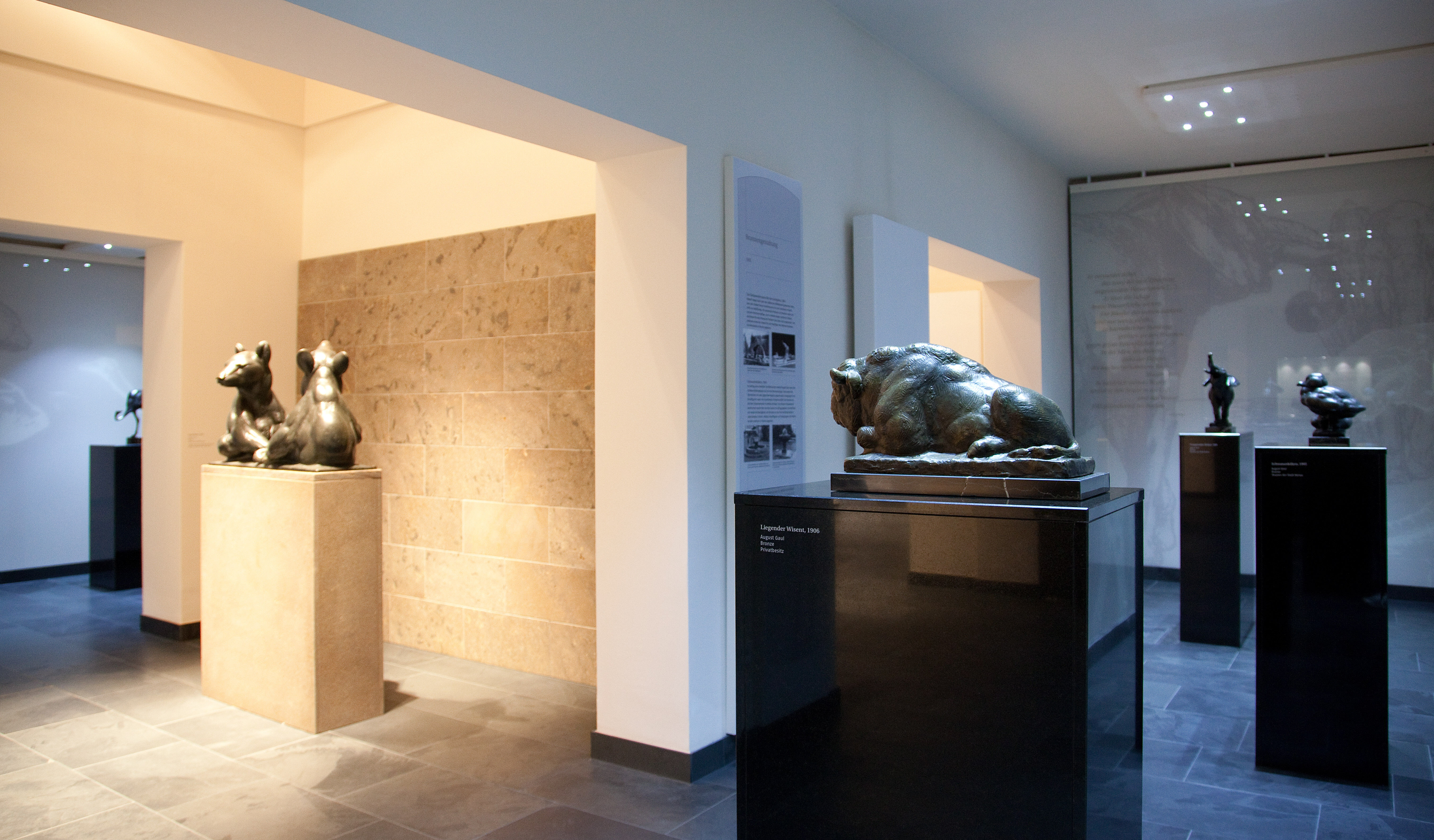 In der Blickachse des Museums sind an Stelle der jungen Bären nun zwei Rehe aufgestellt, die Gaul 1913 für das Denkmal des Malers Walter Leistikow (1865-1908) gestaltete.