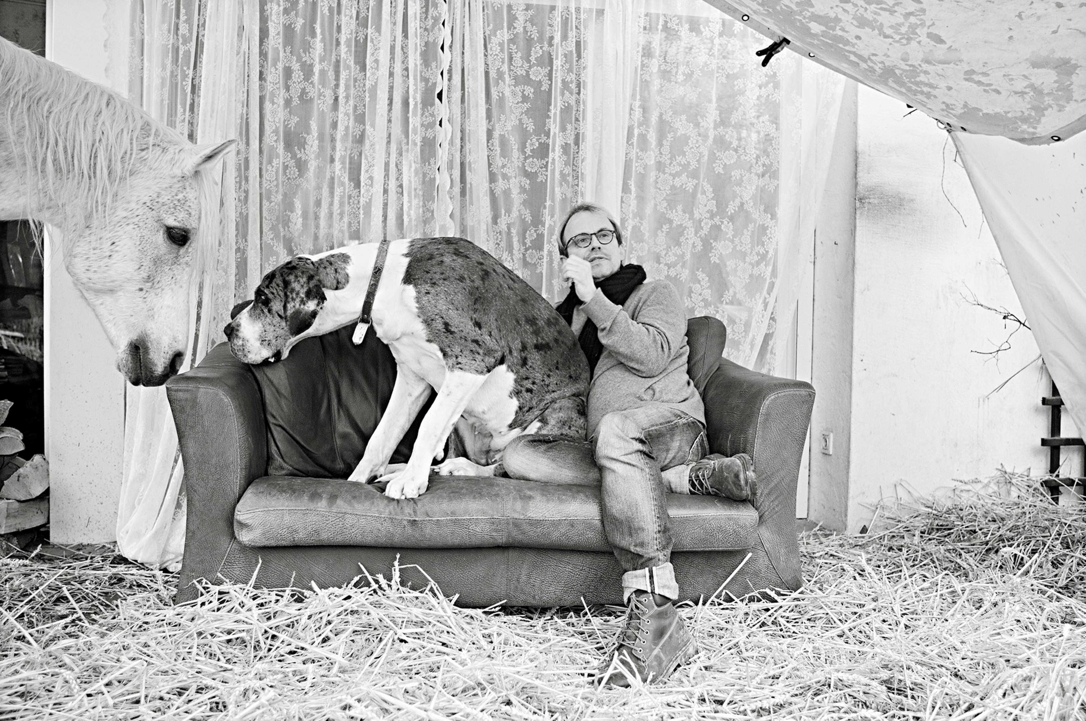 Nein, denn die meisten Protagonisten stammten aus ihrem direkten Umfeld: „Die Männer mit ihren Tieren wurden mir zugetragen oder sind mir zugelaufen, irgendwo begegnet, immer und überall. Auf dem Bauhof, in der Zeitung, im Internet, am Telefon und beim Ausreiten. Ich musste sie nur fragen, und sie haben Ja gesagt. Alle. Bis hin zum Hufschmied, der mit einem Falken auf dem Beifahrersitz zu seinen Kunden fährt.“ Hinzu kamen einige Prominente wie Hilmar Hoffmann, der große Mann der Kulturpolitik mit Rauhaardackel Bastl, und Comedian Henni Nachtsheim („Badesalz“, „Rodgau Monotones“) mit Dogge Mathilda.