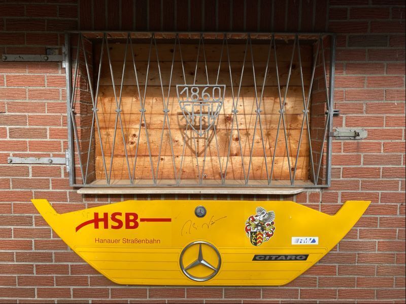 Busklappe mit Rudi Völlers Unterschrift am TSV-Vereinsheim Sandelmühle(© Fachbereich Kultur der Stadt Hanau, Aufnahme: Martin Hoppe)